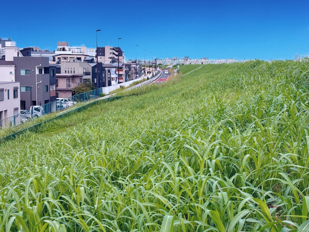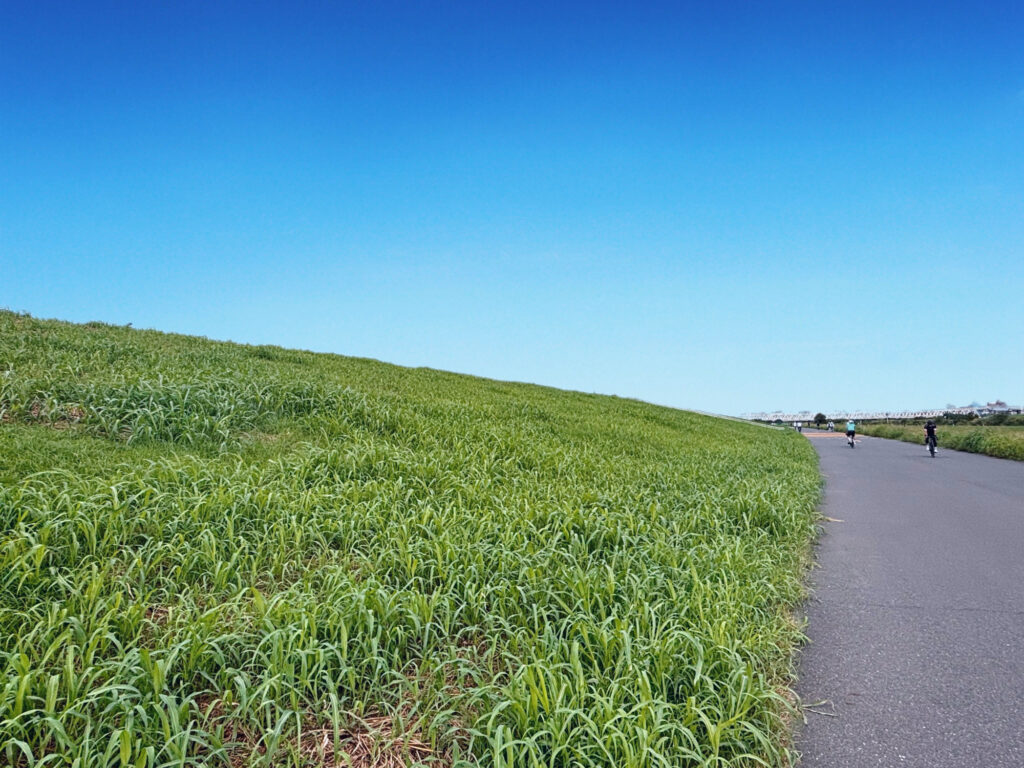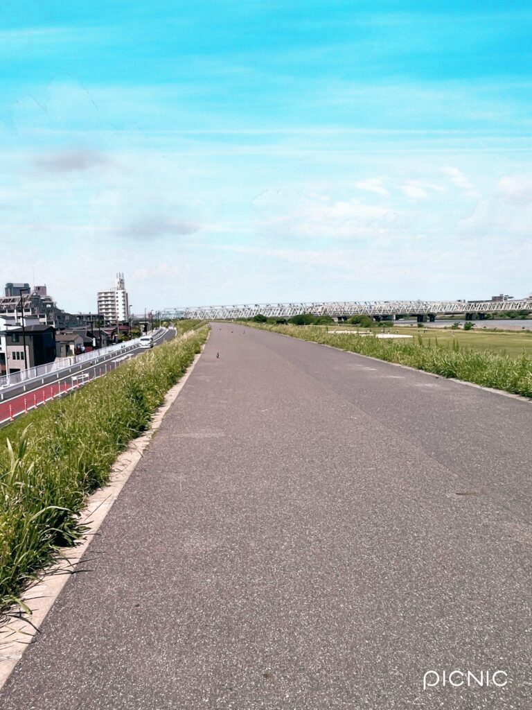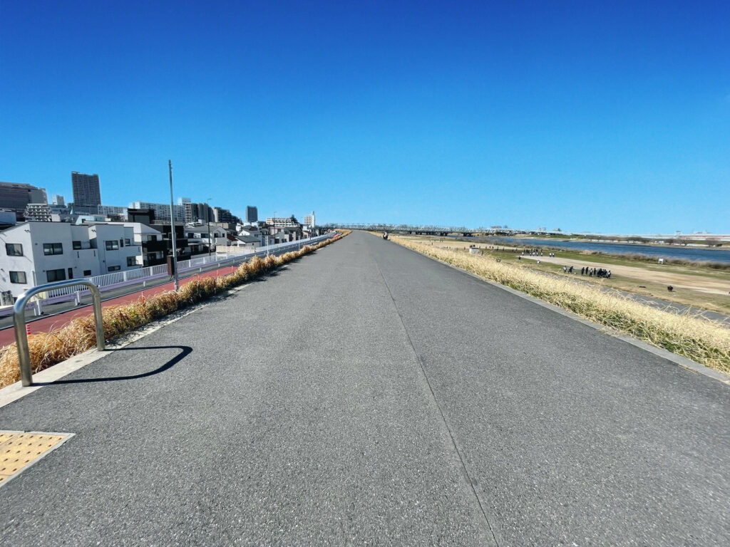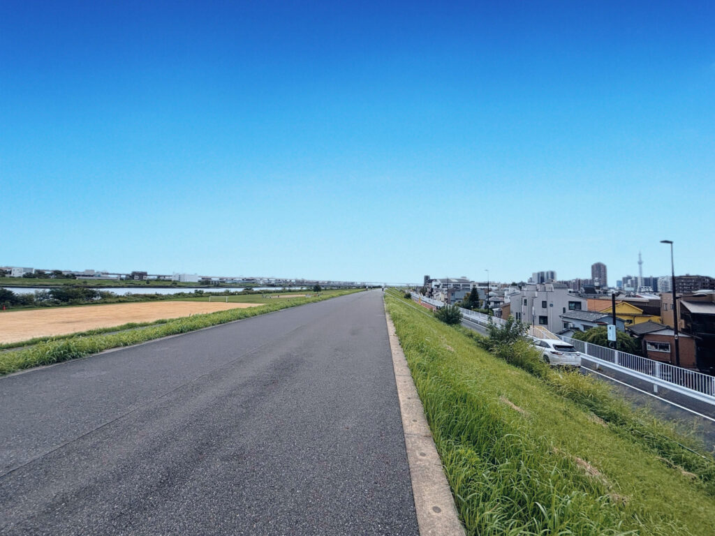 桜中学の生徒が登下校していた荒川土手沿いの道路に車が通行するようになった。新荒川堤防線。
